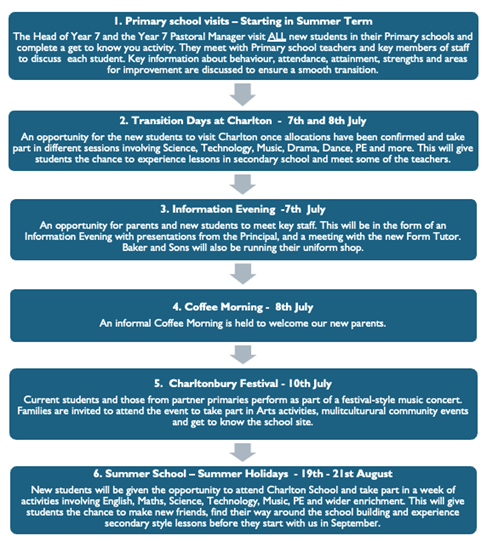At Charlton we pride ourselves in providing our new students and parents a smooth and successful transition from Primary to Secondary school. This is a crucial time in any child’s development, and we aim to ensure they are as prepared as they can be when September arrives. Outlined below are details of the key events in which we hope to make the transition to Charlton School as enjoyable as possible.